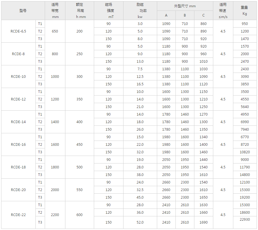 RCDE型油冷電磁除鐵機,內部采用先進的內外置式油循環散熱管設計和內部勵磁線圈獨特繞制技術,全密封結構,具有磁力大、防塵、防雨、耐腐蝕、連續工作使用壽命長等特點。